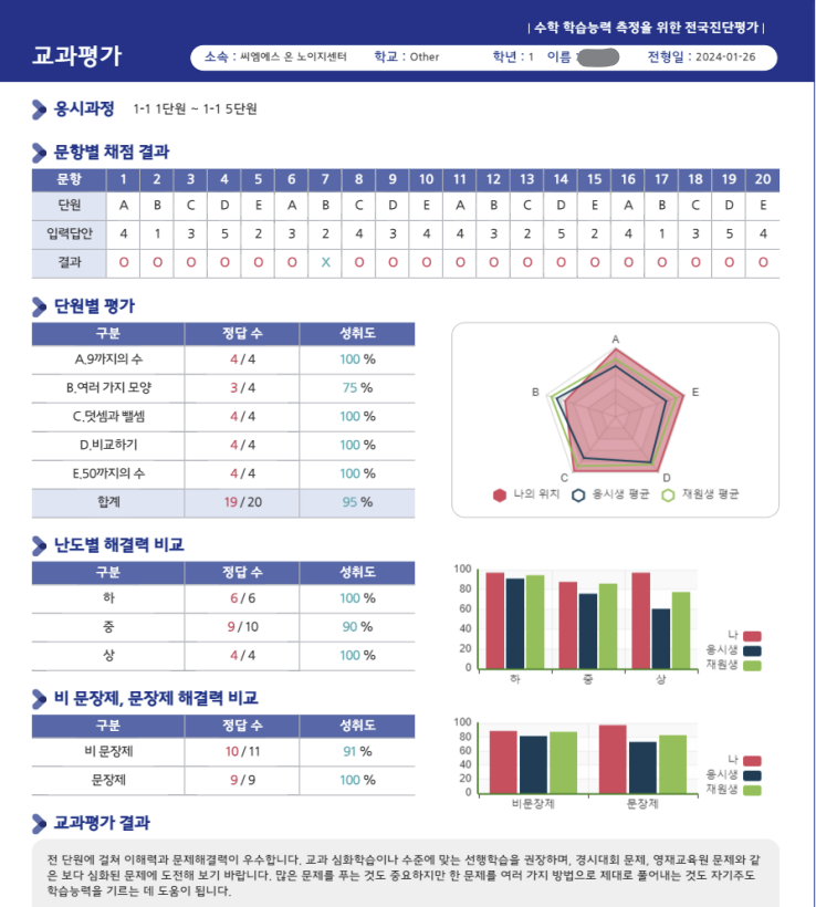 입학 전 예비초인데, 1학년 테스트지로 시험을 보게되었고  교과 과정과 수학적 사고능력 평가 두 가지로 리포트해줍니다.교과는 연산을 이미 2학년 과정을 하고 있기 때문에 다른 사고력 수학 학원의 테스트 결과와 비슷하게 높은 수준으로 나왔지만, 역시 사고력이 필요한 사고해결력 문제는 부족한 부분이 많이 보였습니다. 그래도 A반이 나왔구요, (이 레벨은 노이지 레벨에서 가장 아래 레벨인 1학년 수준의 레벨입니다.) 만약 더 틀렸다면 노이지 입학 못할뻔 했어요. 근데 아직 줌 수업을 90분간 하기엔 집중력이 따라주지 않을 것 같아서 노이지 등록도 하지 않았습니다.노이지 수업료는 CMS 오프라인 수업보다 수업료가 저렴한 편이라 더 가성비가 좋게 느껴지기 때문에 가까운 CMS지점이 없다면 노이지도 차선책으로 좋은 선택지인 것 같습니다. 저도 1학년 하반기에는 다시 도전할 생각입니다. (하지만 CMS오프라인 과정과 마찬가지로 수업료는 3개월치를 한 번에 결제해야 합니다.)