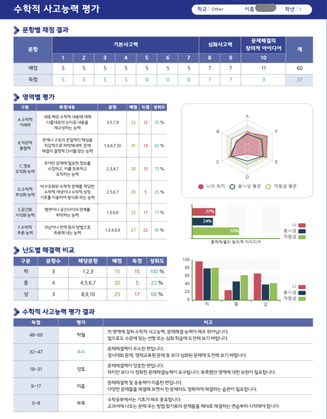 1학년 입학 전 총 3군데의 사고력 수학 학원인 와이즈만 수학, 시매쓰수학, CMS(노이지) 레벨 테스트를 봤는데 전반적으로 추구하는 교육 방식은 다르지만, 전반적인 레벨 테스트 방식과 결과는 비슷하게 나온 것 같습니다. 사고력 수학 학원을 알아보신다면, 아이마다 맞는곳과 부모님이 추구하는 교육 방식이 다 다르기 때문에 모두 방문하여 테스트와 상담 진행 후 결정하시기를 추천드립니다.