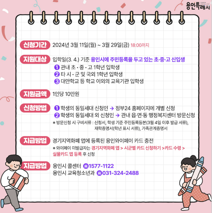 경기도에서는 유일하게 용인시에서는 관내 초중고 입학대상자들 모두 입학지원금을 신청할 수 있습니다.