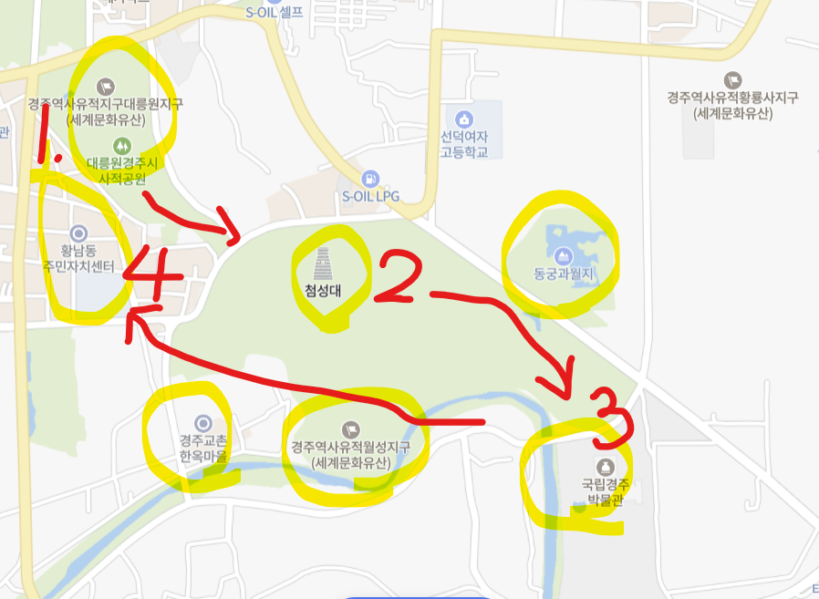 1~3번까지 천마총, 대릉원, 첨성대, 동궁과 월지, 경주 국립 박물관, 황리단길은 다 걸어서 다닐 수 있는 곳입니다.