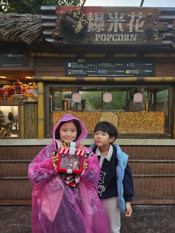 입장하자마자 아무생각 없이, 줄이 짧길래 탔던 급류타기. 11월 초라서 날씨가 꽤 추워서 물에 젖을까봐 줄설때 파는 10위안짜리 허접한 우비를 사서 입었습니다. 생각보다.....짜릿했어요! 안에 동굴을 지나가는데 꽤나 스릴있고 물도 많이 튀겨서 더 재밌었네요. 아이들도 만족했고, 꿀팁은 근처에 팝콘과 팝콘통 너무 예뻐요. 팝콘도 너무 맛있어서 꼭 사드세요.