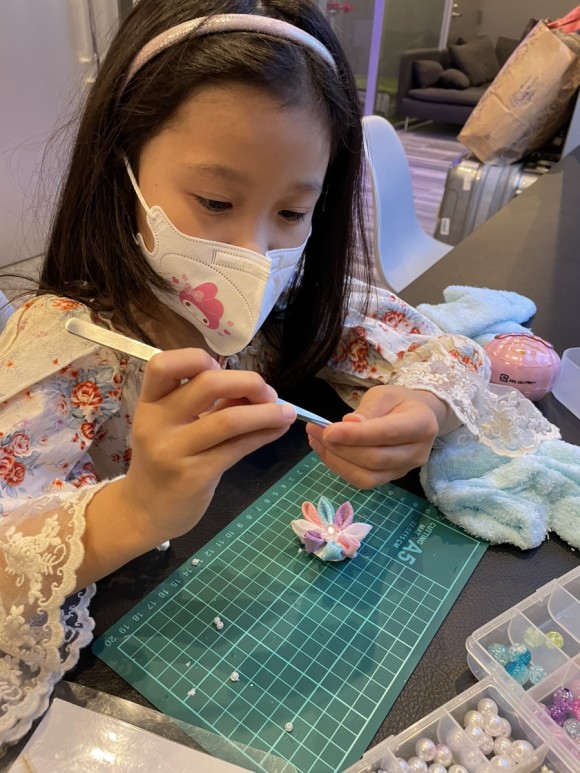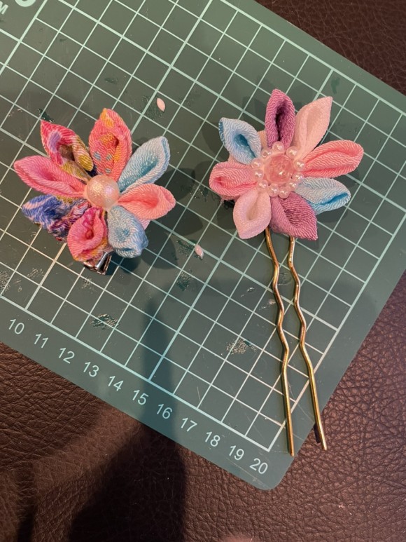 꼼꼼하게 완성 후, 실제 완성된 작품입니다. 저희 아이는 비녀와 같이 꽂는걸로, 저는 그냥 핀으로 만들었어요.