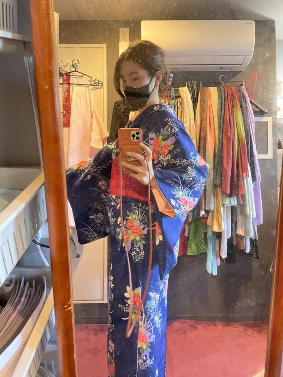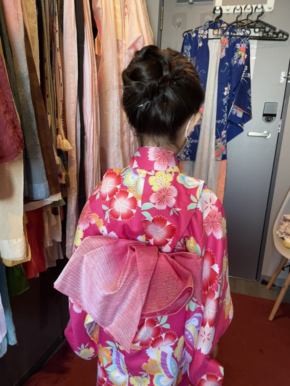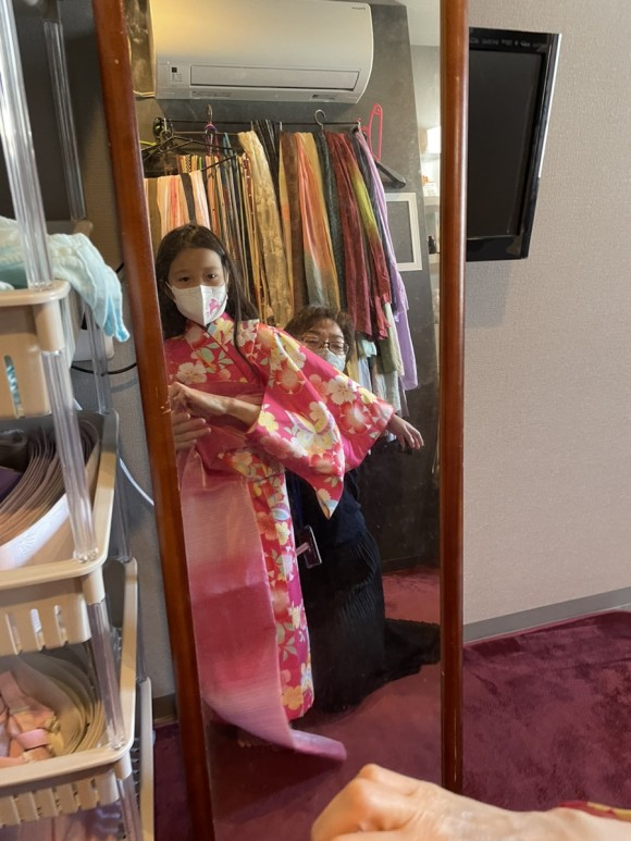 이제 만든 전통핀과 함께, 기모노를 직접 골라서 입어볼 수 있습니다. 기모노 종류과 사이즈가 엄청 많이 구비되어 있구요, 본인 취향대로 고른 뒤 위에 올라가서 갈아입어봅니다.