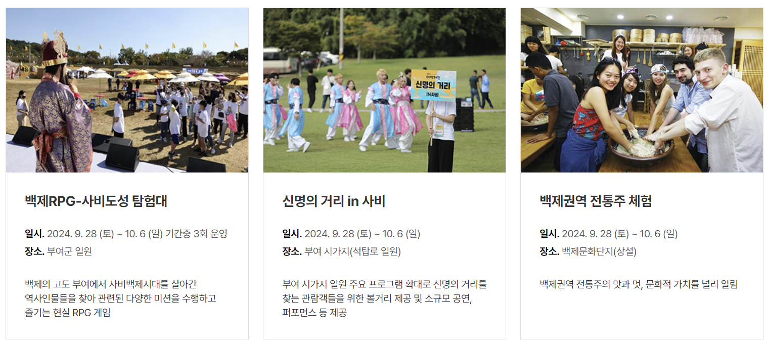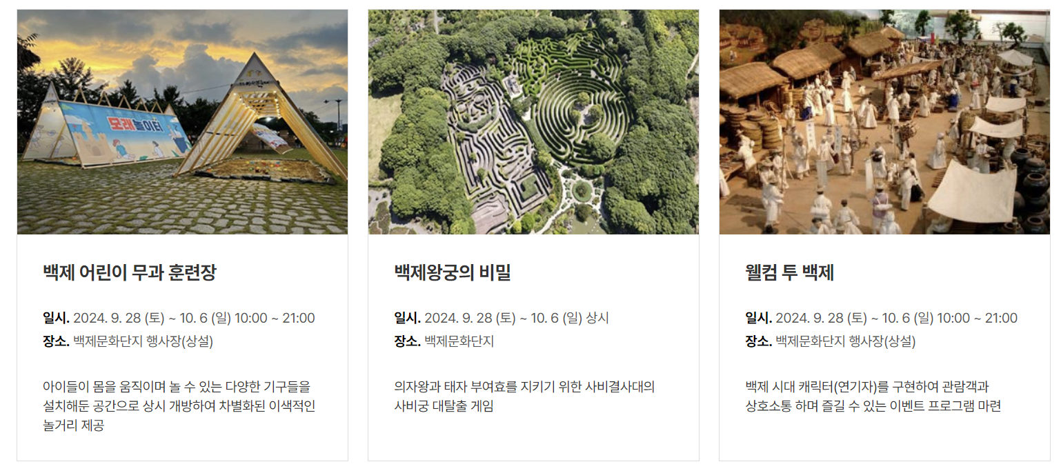 국내 지역 문화제 치고도 무려 9일간 진행되는 기간과 규모가 엄청나기 때문에 꼭 한 번 가보고 싶었는데 이번 10월 연휴때 맞춰서 가게 되어서 정말 엄청 기대가 됩니다. 총 9일의 기간 동안 매일매일 공연과 이벤트 등이 다르기 때문에 자세한 일정은 백제 문화제 홈페이지에서 확인해 보시기를 바랍니다.
