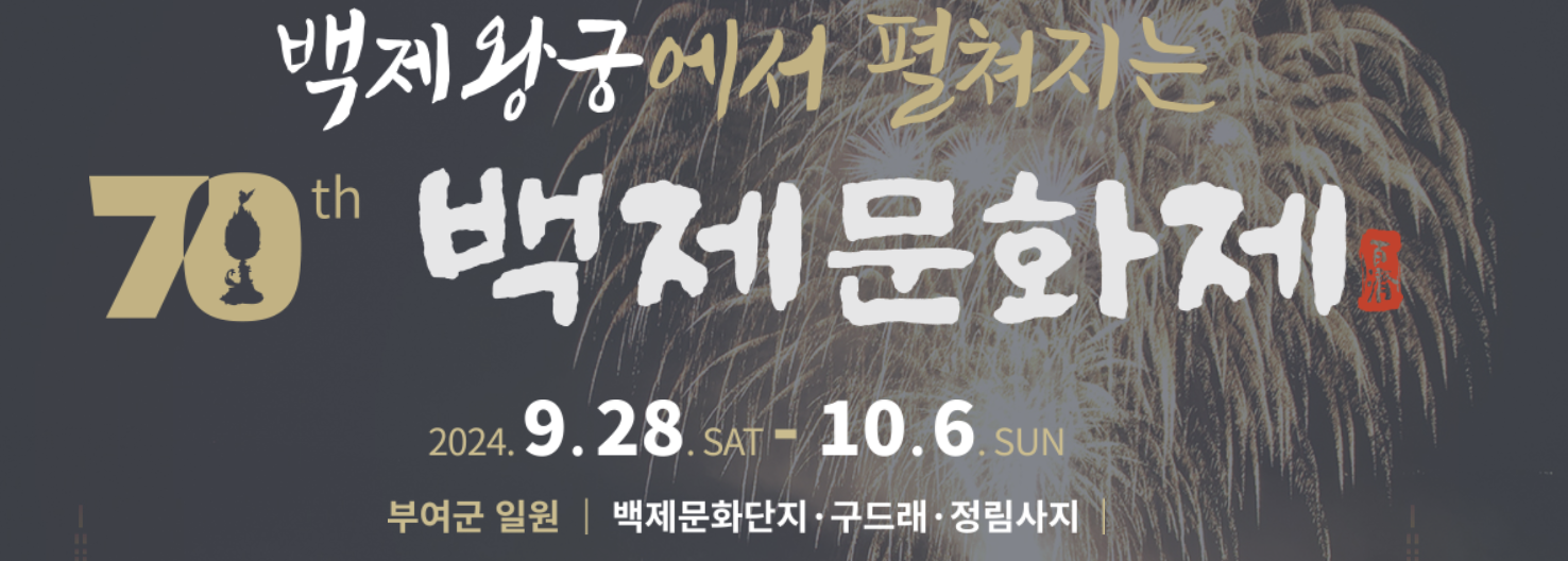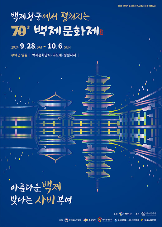 올해로 70회를 맞는 백제문화제가 9월 28일(토)부터 10월 6일(일)까지 9일간 백제문화단지(주 행사장),부여읍 시가지, 규암면 신리 등 부여군 일원에서 개최됩니다.