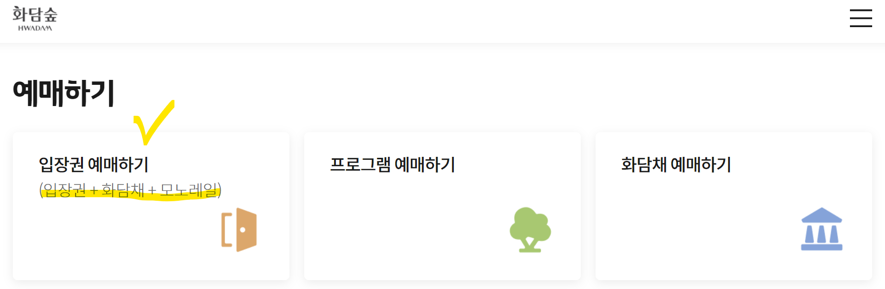 입장권(필수)/화담채/모노레일(선택예매)을 각각 선택해서 예약해 주시면 되겠습니다.