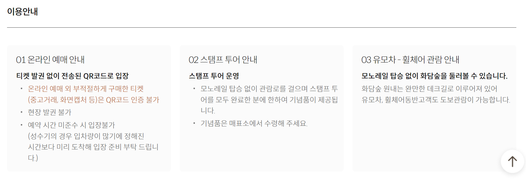 모노레일을 타지 않아도 관람로를 걸으며 스탬프 투어도 가능하고, 유모차-휠체어의 경우에도 완만한 데크길을 따라 도보 관람이 가능하기 때문에 모노레일 예약은 필수사항이 아닌 점 확인해주세요.