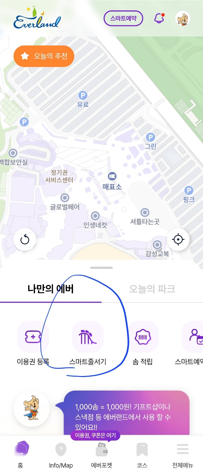 1. 입장하자마자 제일 먼저 할 일은 에버랜드 어플 통해서 입장권 등록 후, 스마트줄서기를 해주세요.