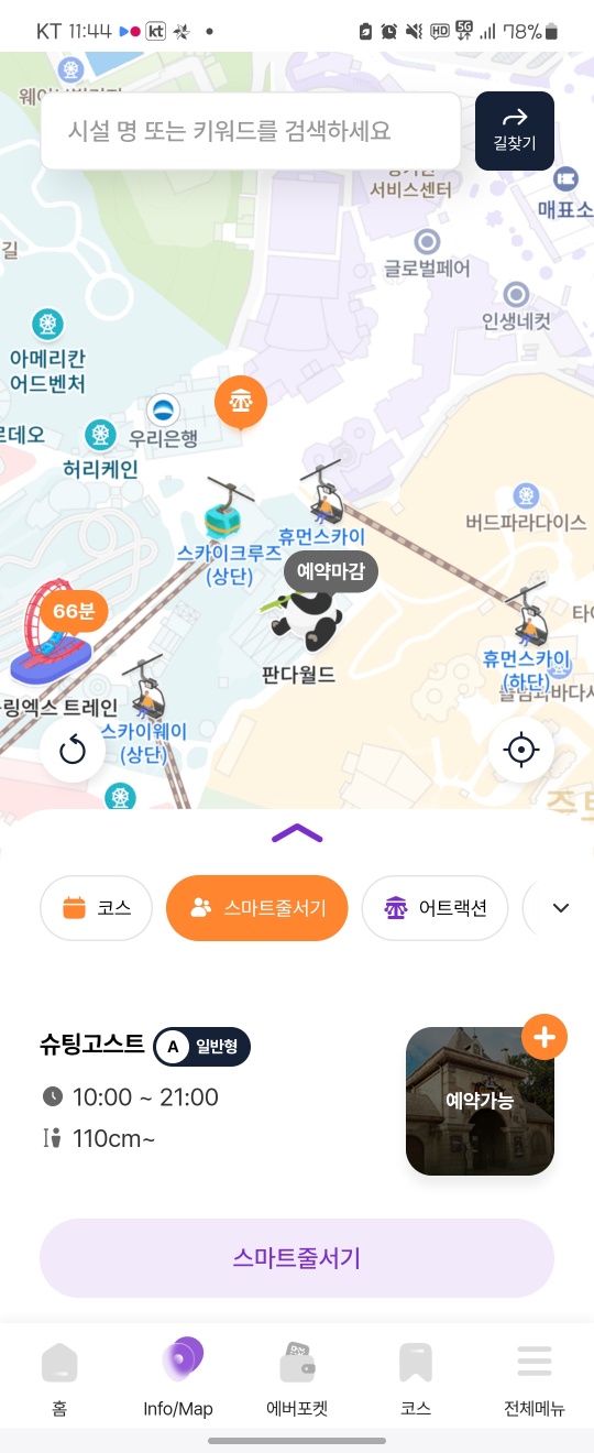 오전에는 스마트줄서기만 하는 곳이 많이 있습니다. 저는 썬더볼트를 했는데 2시간 후 입장 가능이었어요.